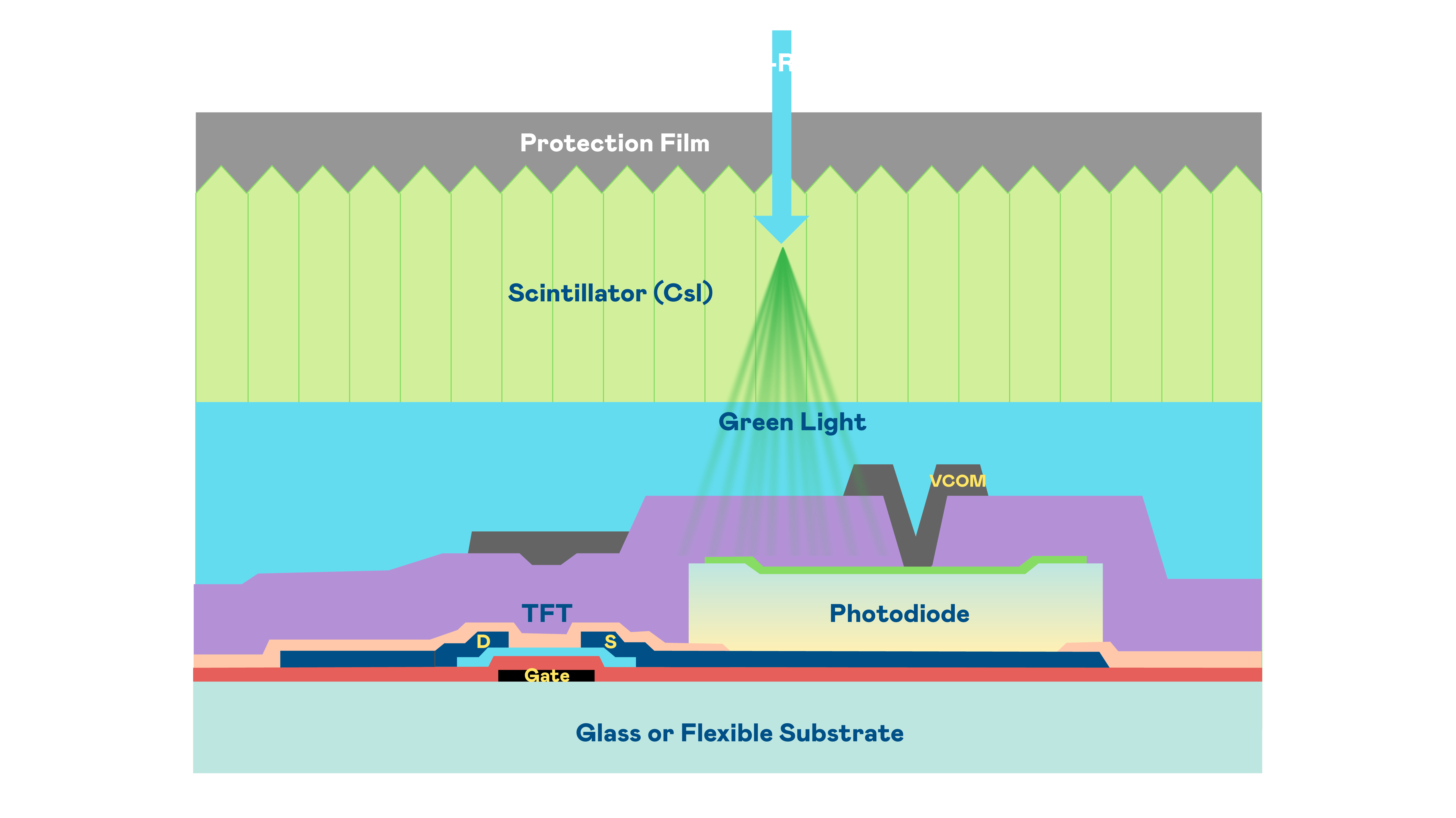 门徒娱乐的X光影像感测阵列使用薄膜电晶体 (TFT) 作为每个像素的读取开关,搭配光电二极体(Photodiode)的光电转换元件,用以感测X光影像讯号。